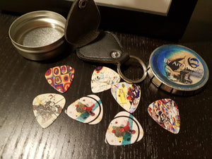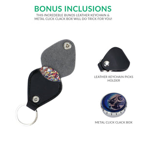 All guitar picks come with a leather keychain pick holder and metal click clack box! A $10 value absolutely FREE!