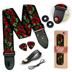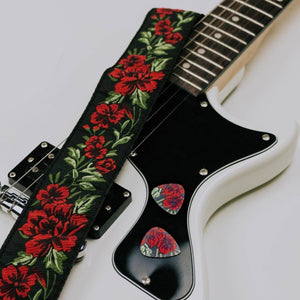 Order today and you will get not only the Red Roses Guitar strap, but also 2 Red Roses Guitar Picks, a strap locker, and extra attachment strings!