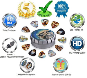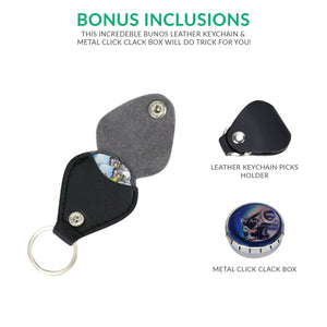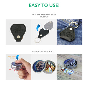 All guitar picks come with a leather keychain pick holder and metal click clack box! A $10 value absolutely FREE!