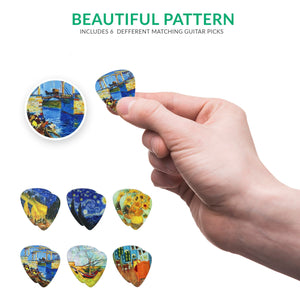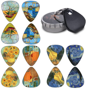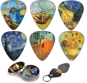 Order today and besides 12 Van Gogh guitar picks, you will get a leather keychain pick holder and a metal click clack box for FREE!