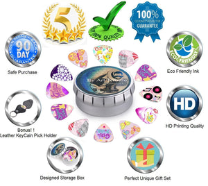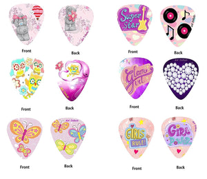 - 12 pink guitar picks - 6 different girly designs that are printed in HD, so all the colors are vivid and existent.
